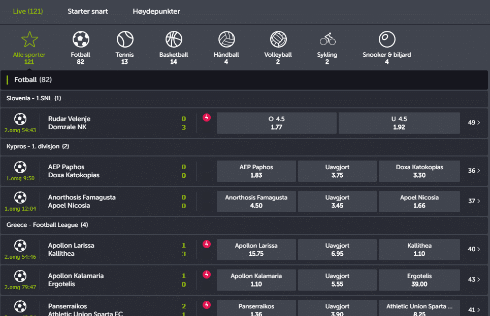 Om du hellre vill spela samtidigt som matchen eller evenemanget spelas, då kan du istället ta en titt på deras sektion för live odds. Även här hittar du massvis med olika alternativ att spela på, allt från slutresultat, vem som gör mest mål, eller någon av alla andra tusentals alternativ.